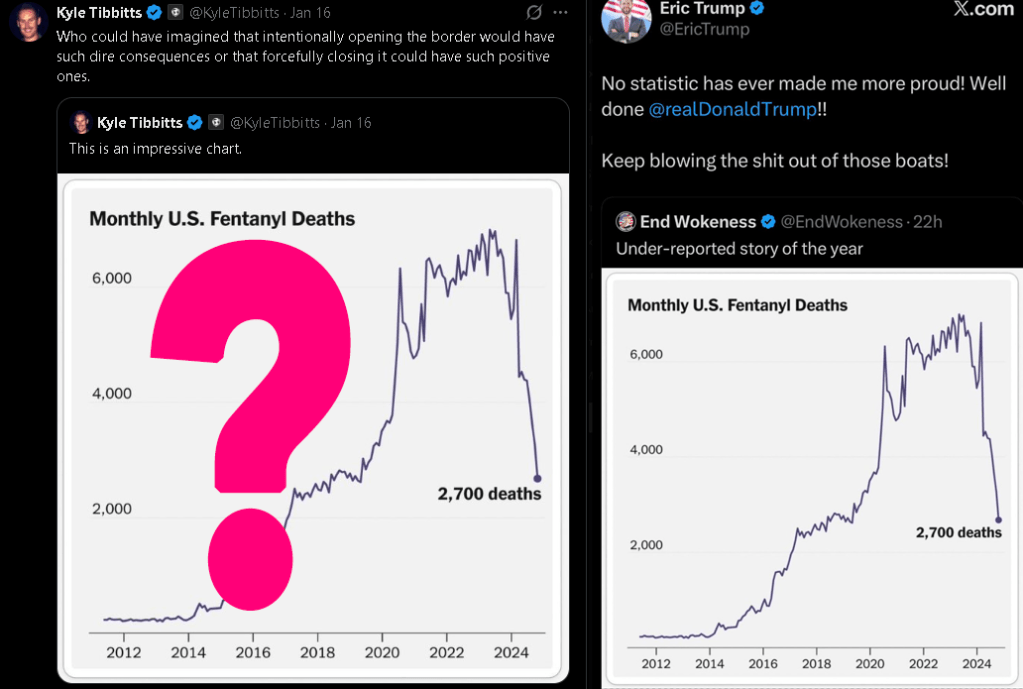 Many big right wing accounts on X recently started spreading a peculiar graph. The graph shows monthly fentanyl deaths in the US from around 2012 up to the latest known data point at the time of printing in early 2025, and originated in the New York Times. The way it is framed suggests fentanyl deaths skyrocketed under Biden, and are now plummeting under Trump. But is it, really?